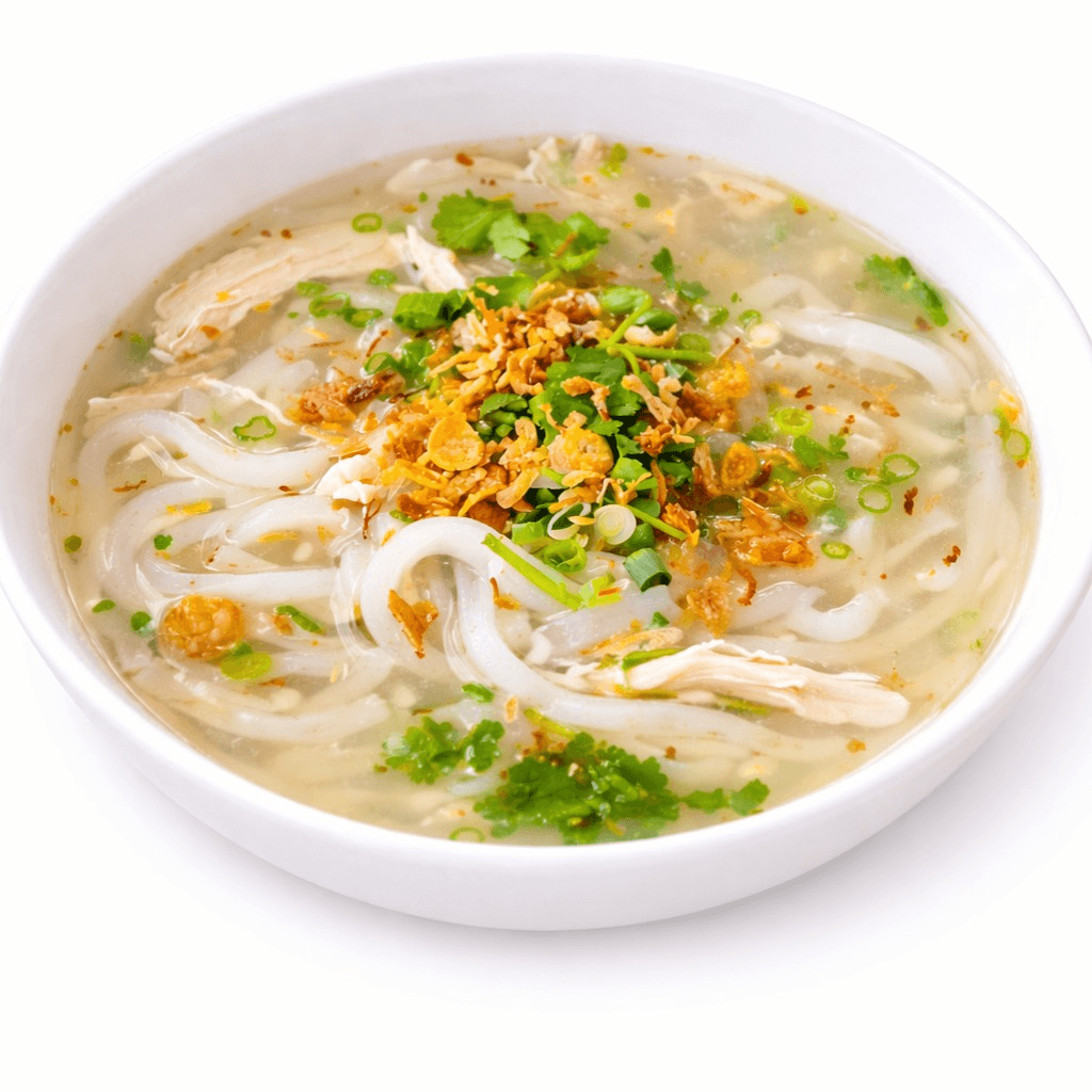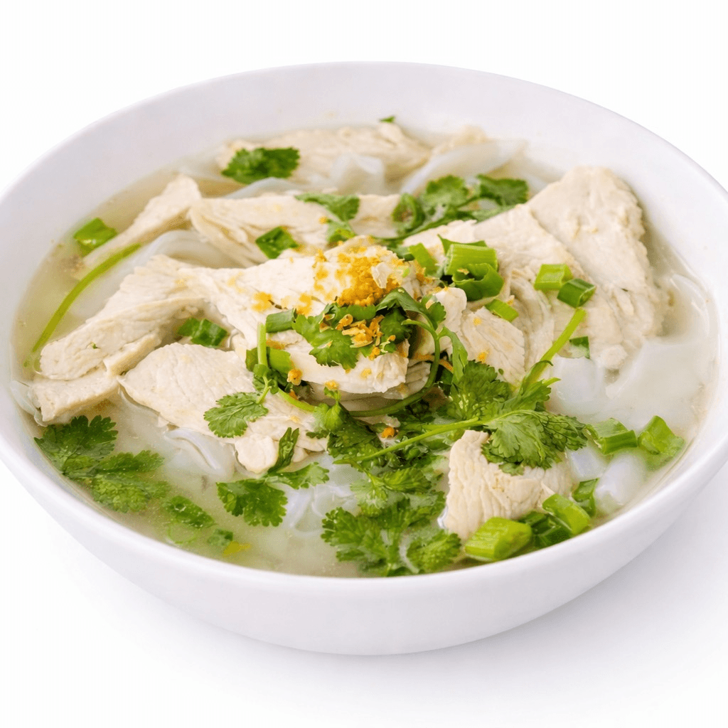 Homemade rice noodles in thicken chicken broth served with sliced chicken and ground chicken