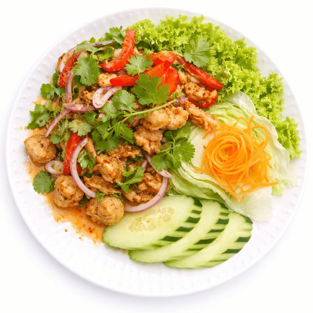 Fried chicken salad mixed with red onions, mint, cilantro in lime-chili sauce