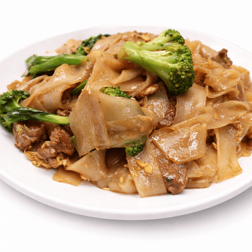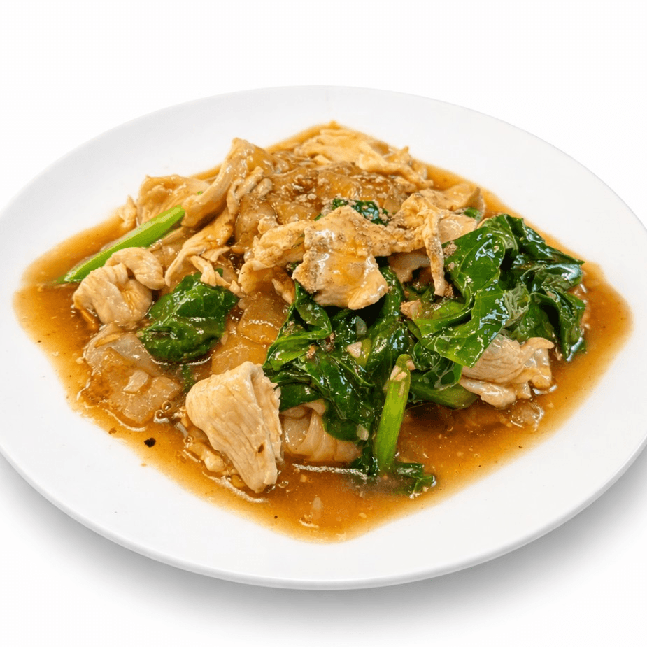 Stir fried wide rice noodle with choice of chicken, beef or pork and chinese broccoli in gravy