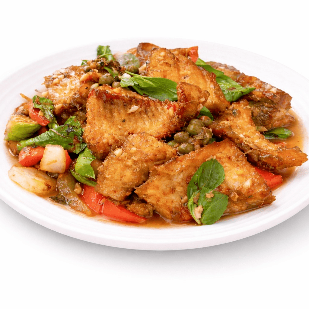 Sauteed catfish with onions, red bell peppers, chili, rhizome, basil and thai eggplants