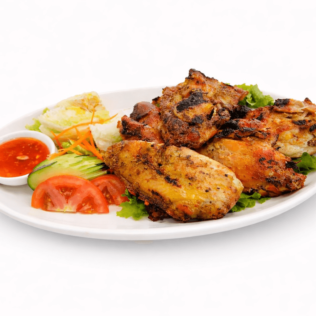 5 pieces. Grilled chicken shewers marinated in herbs, spices, and yellow curry served with peanut sauce and cucumber salad