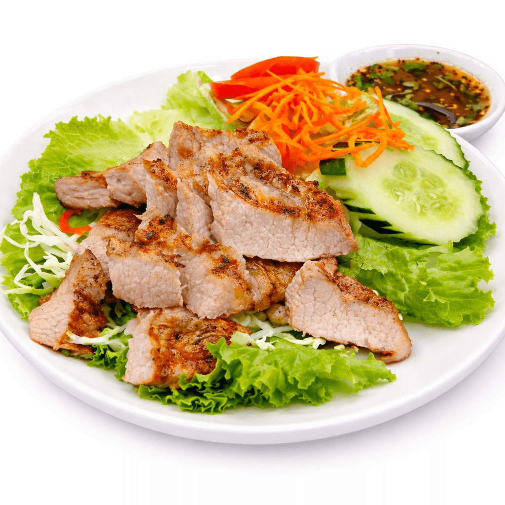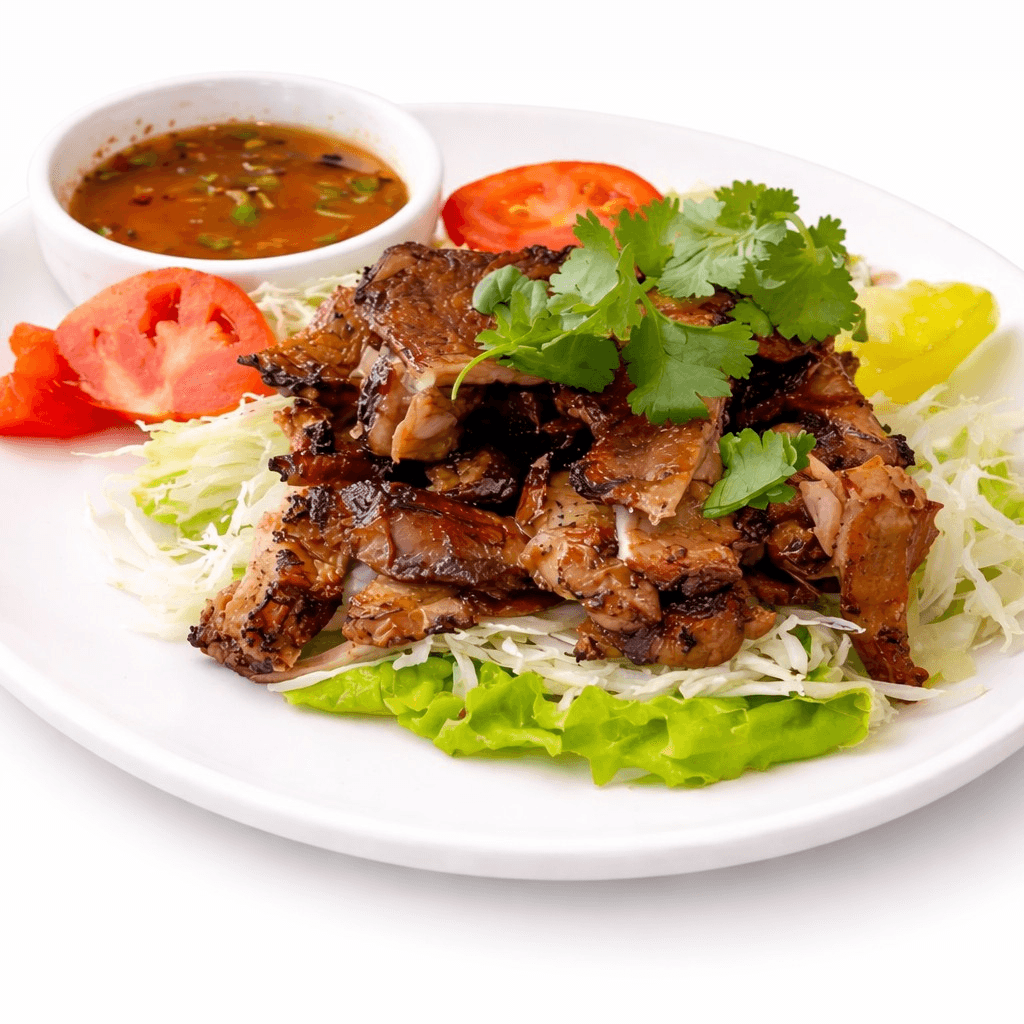 Grilled pork neck mixed with onions, mints, cilantro, and ground roasted rice, in chili lime dressing sauce