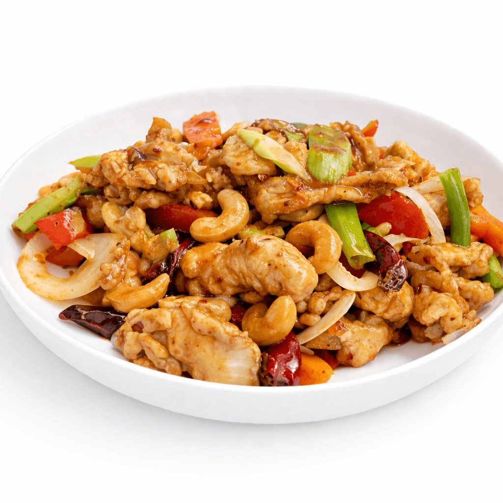 Sautéed chicken with cashew nuts, onions, dried chili, carrots and red bell peppers