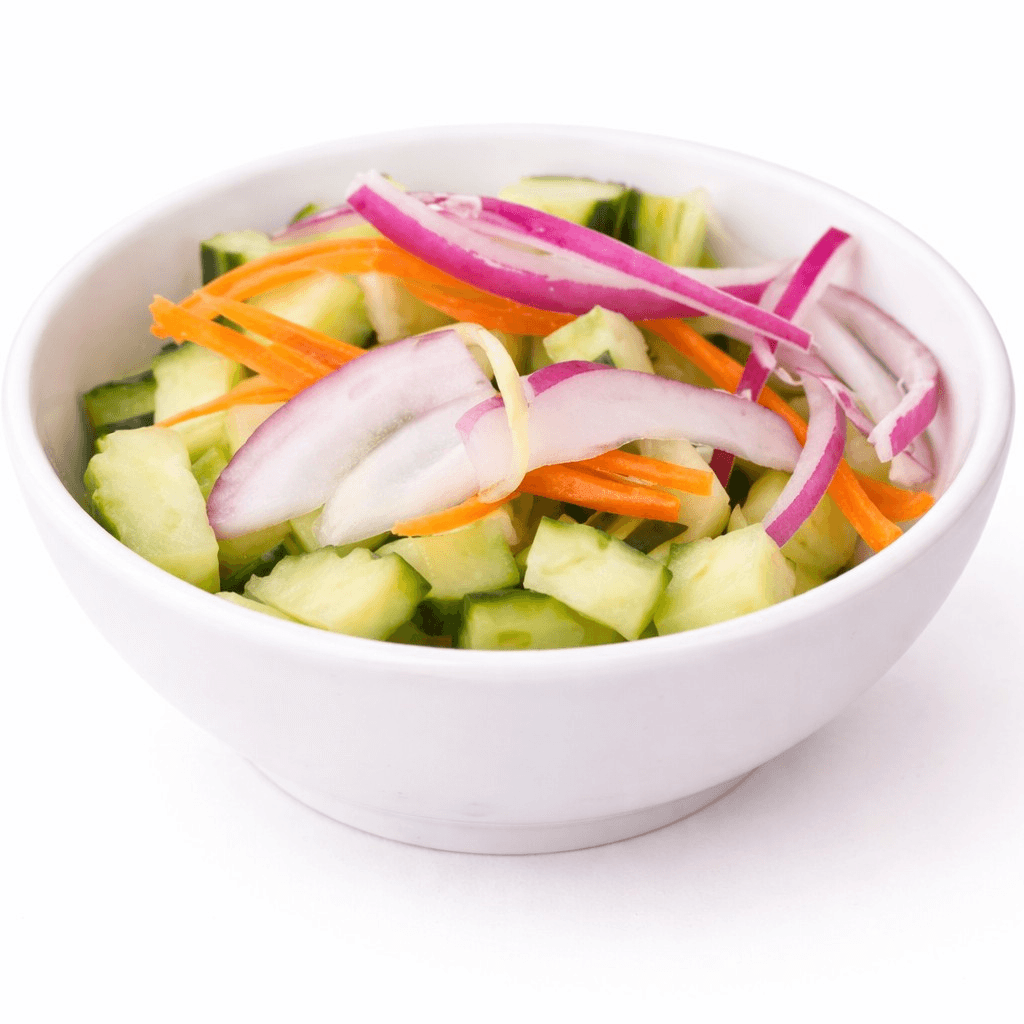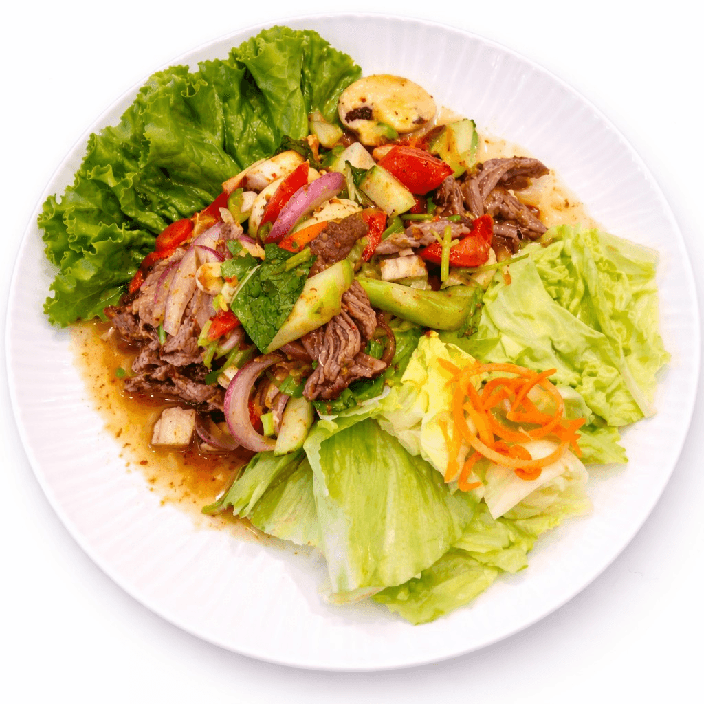 Spicy! Iceberg lettuce with sirloin beef, onions, chilis, mushrooms, cucumbers, basil, tomatoes, and lime dressing.