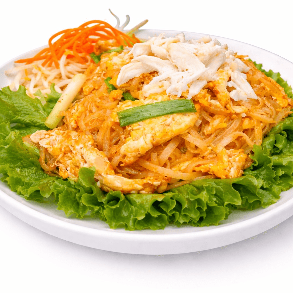 Stir fried spicy Thai noodle with dungeness crab meat, egg, and green onions