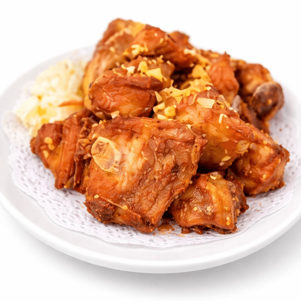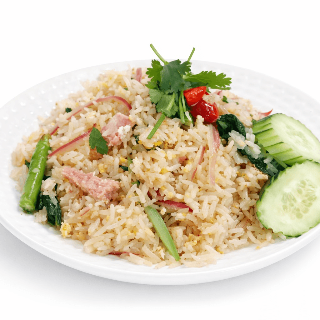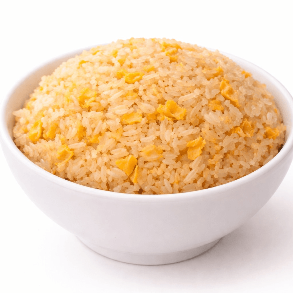 Fried rice with eggs served with choice of fried chicken or thai style curry BBQ chicken