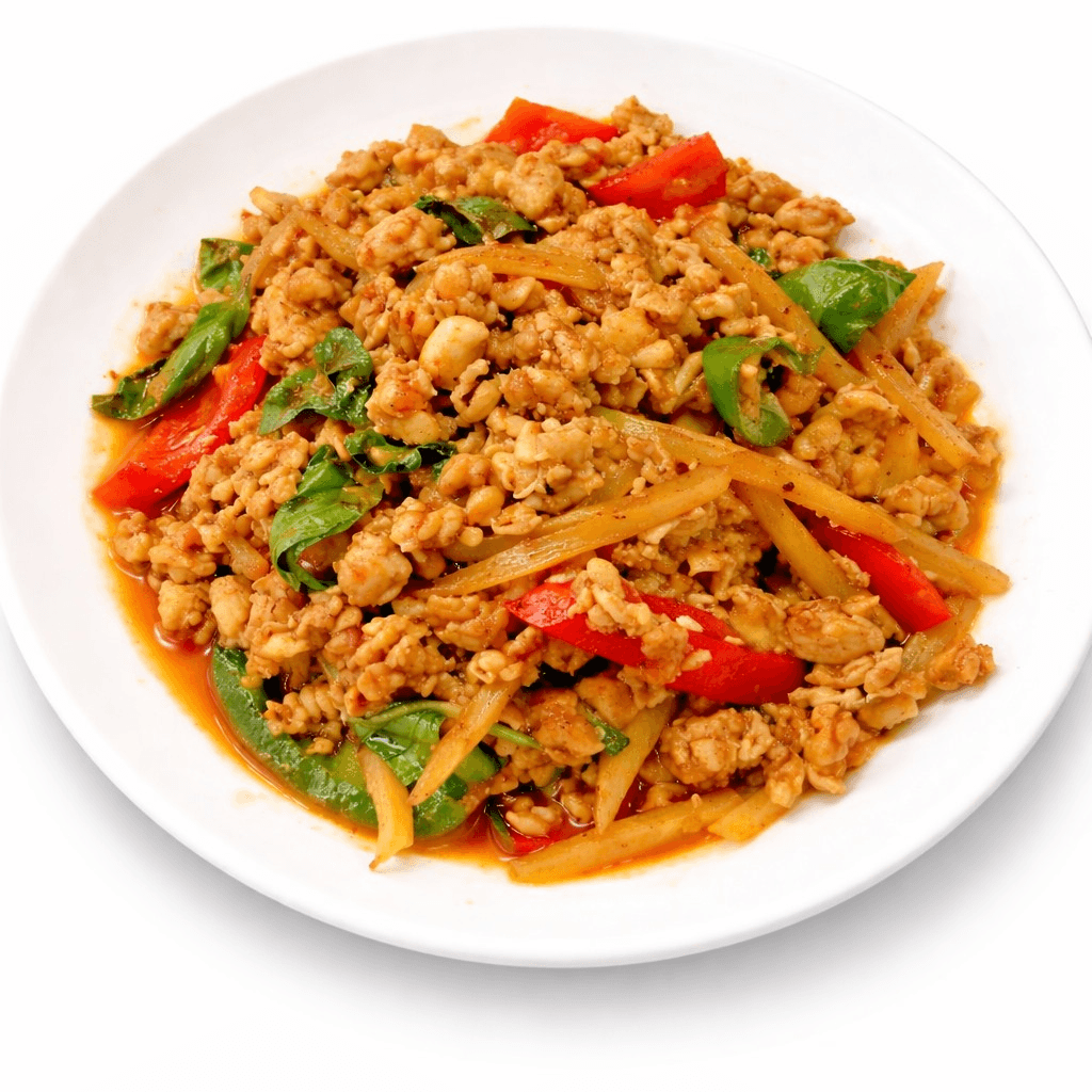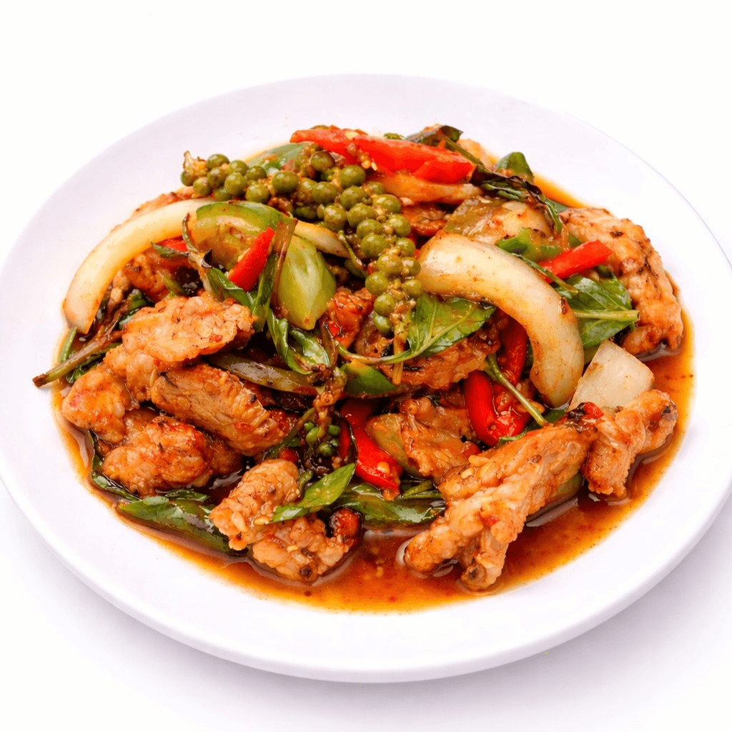 Stir fried pork in house made chili paste, thai eggplant and rhizome