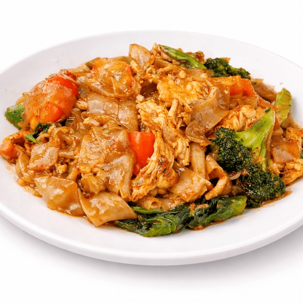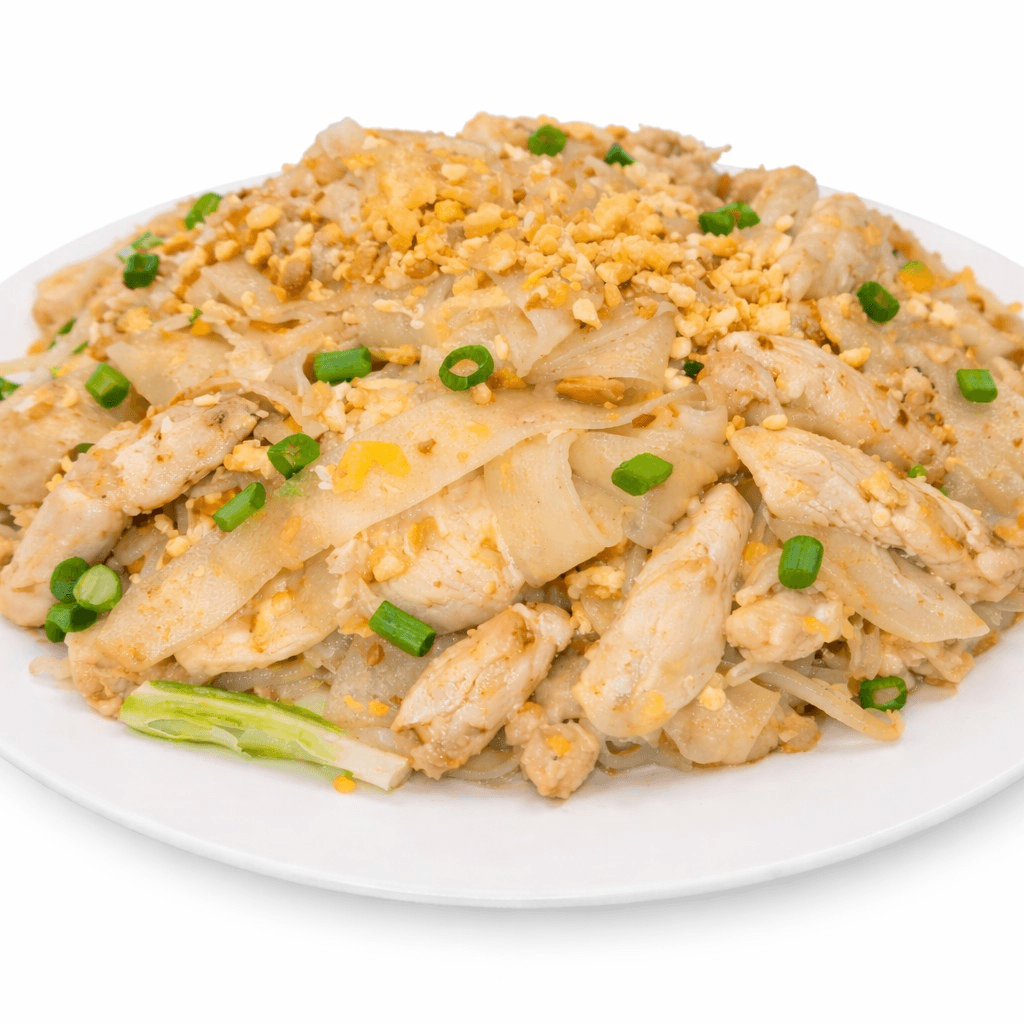 Wide rice noodles with your choice of protein, eggs, carrots, and broccoli.