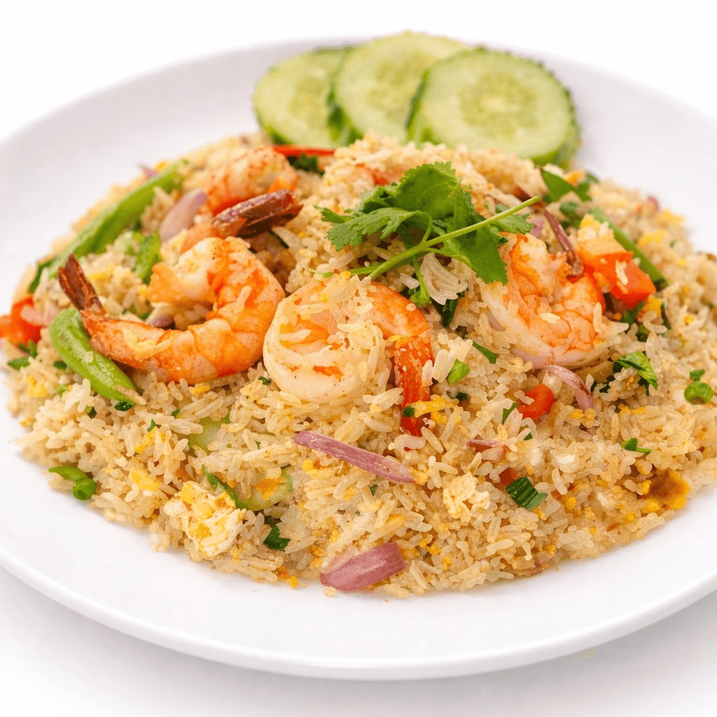Fried rice with yellow curry powder, shrimp, onions, celery and egg served with cucumber salad