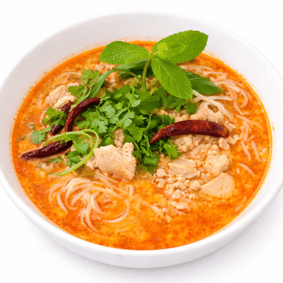 Special red coconut curry soup served with round rice noodles, chicken, shredded cabbage, and bean sprouts