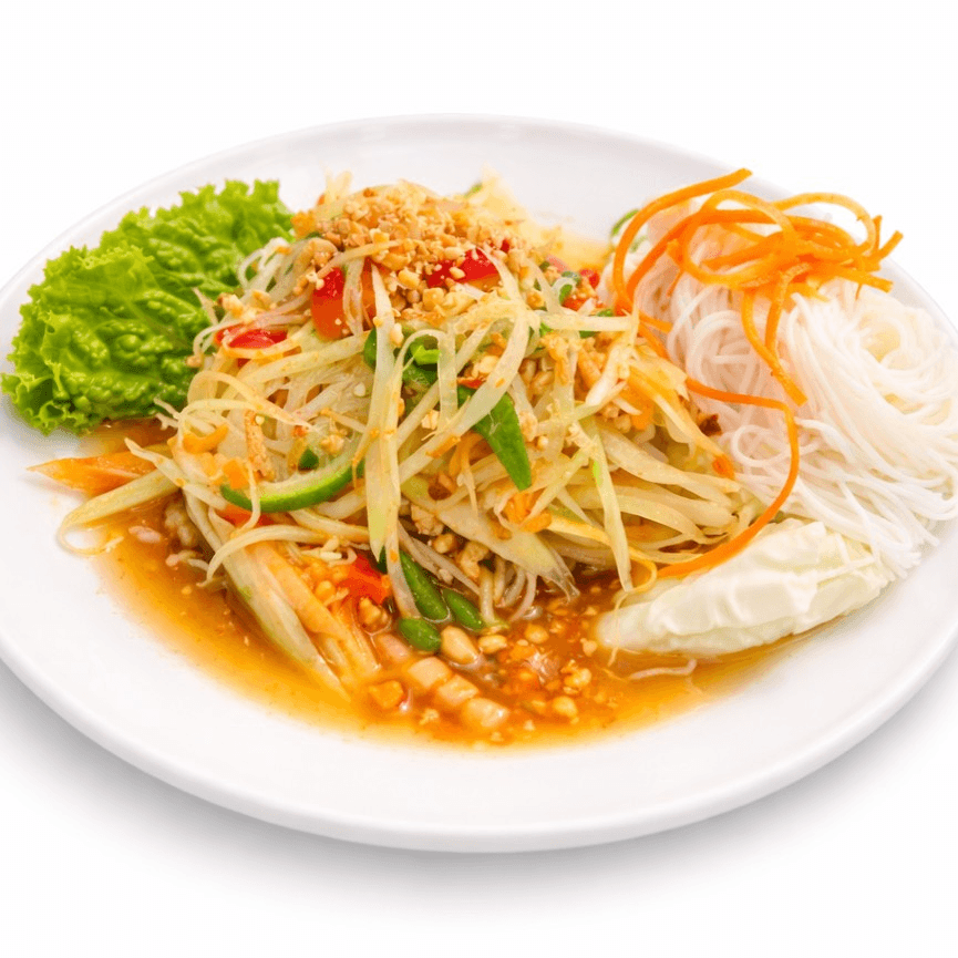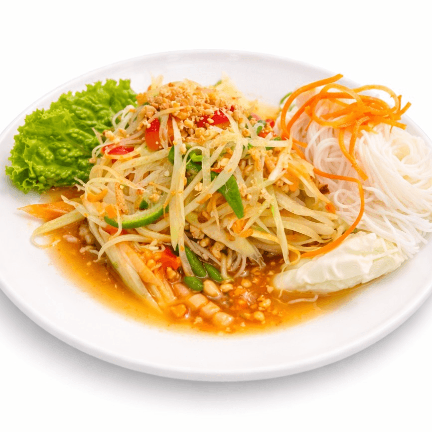 Shredded green papaya salad with dried shrimp, tomatoes, green beans, carrots, and peanuts tossed in a chili-lime dressing