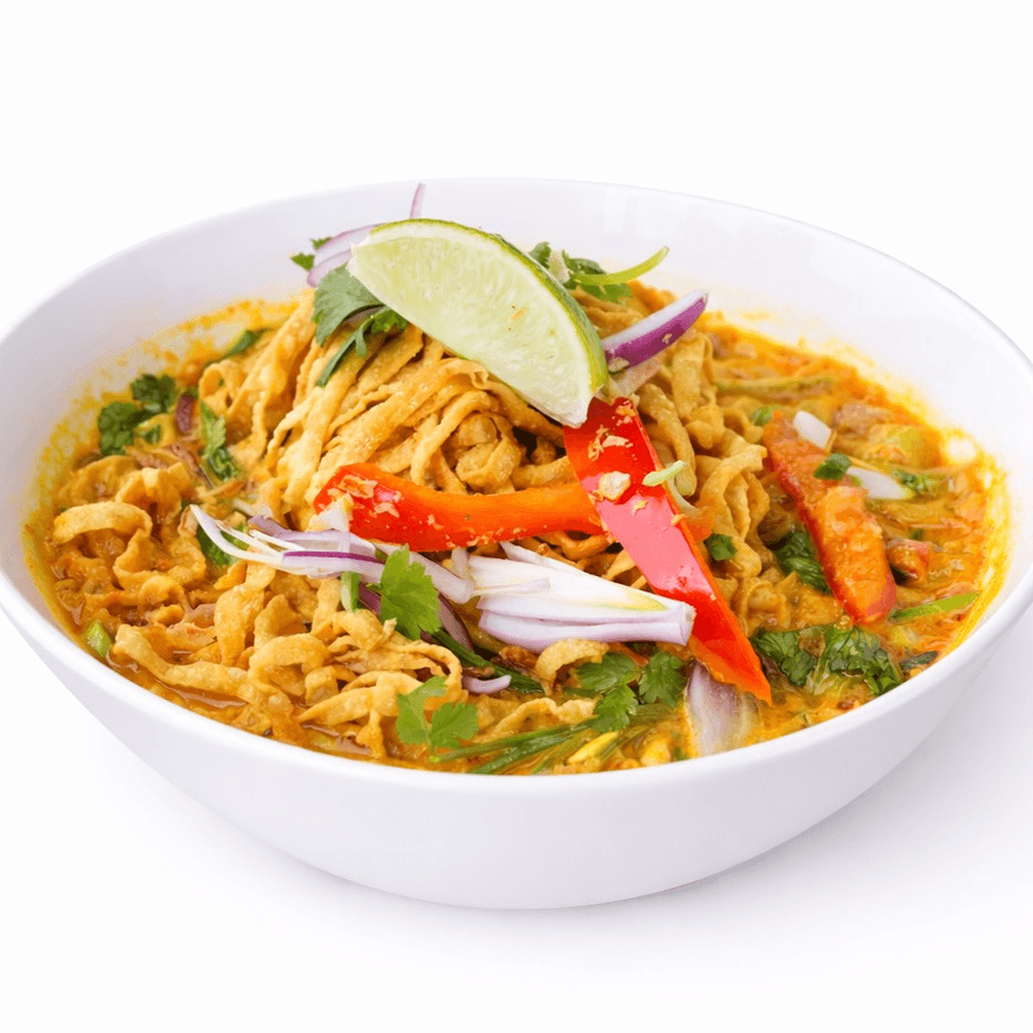 Egg noodles served in light yellow curry soup with chicken, pickled mustard greens and red onions topped with fried egg noodle