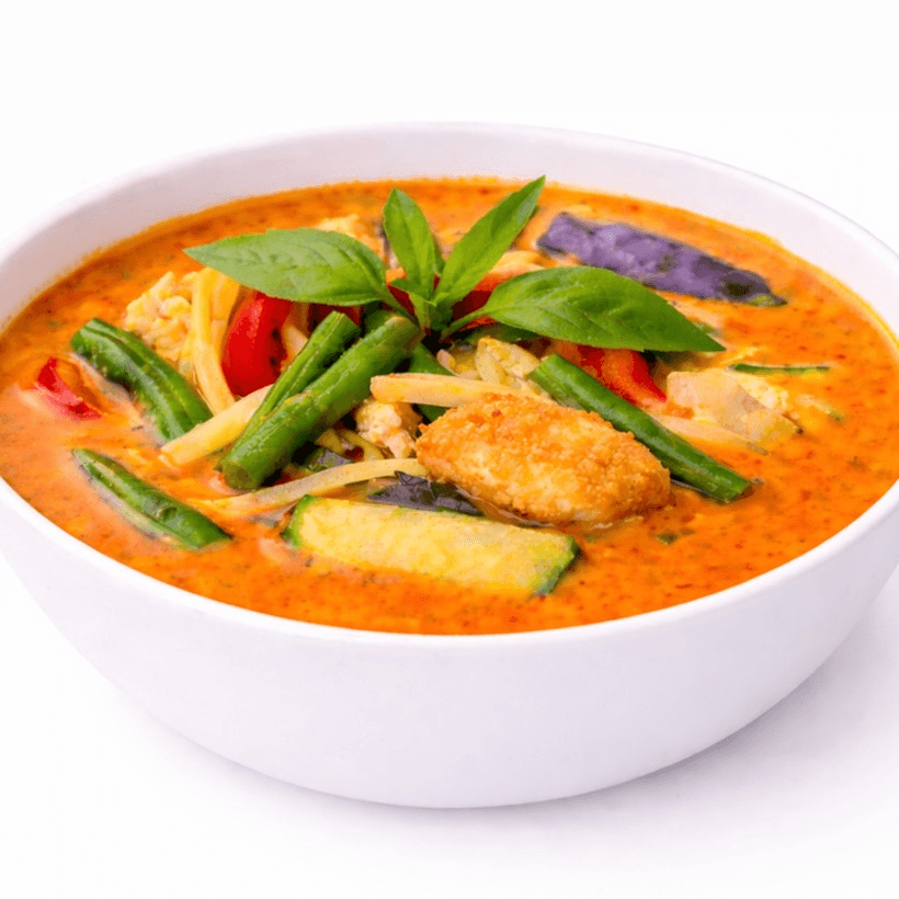Gluten Free. Red curry with green beans, bamboo shoots, eggplants, red bell peppers, and fresh basil serve with rice