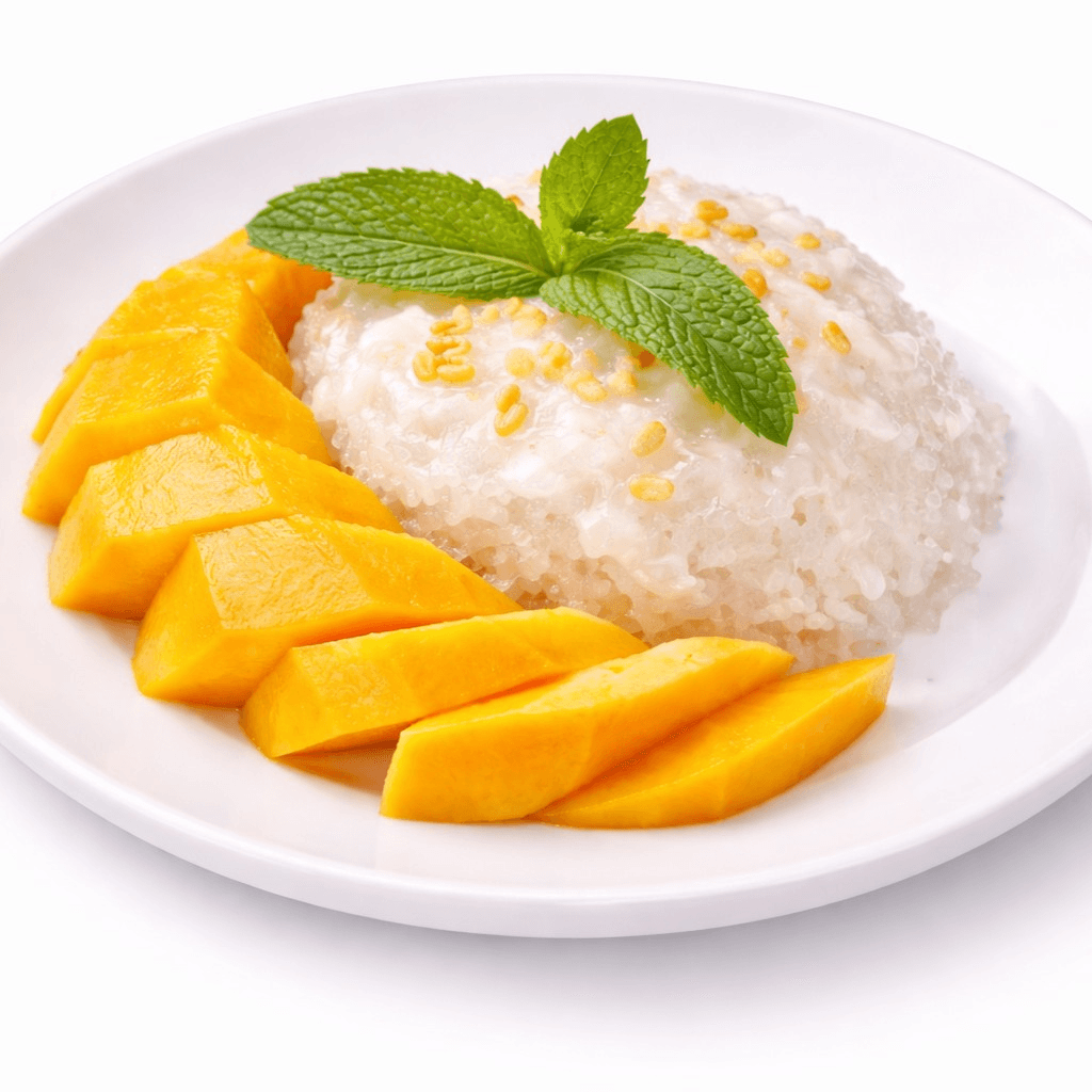 Sweet coconut sticky rice served with fresh sliced mango (seasonal)