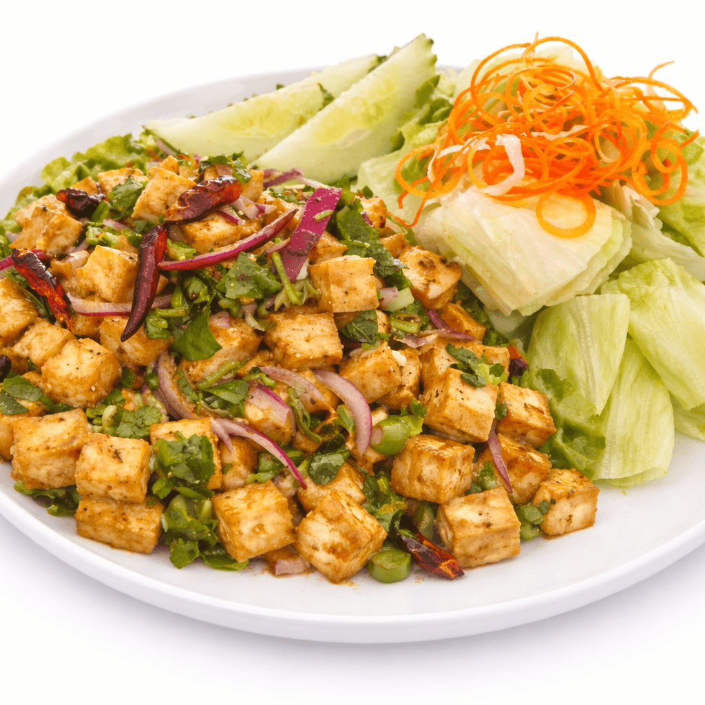 Fried tofu with red onions, mint leaves, cilantro, and roasted rice in lime dressing
