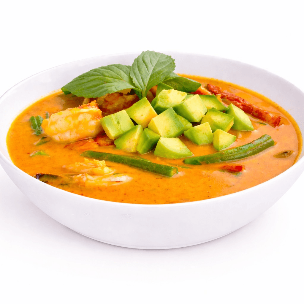 Gluten Free. Shrimp and avocado in panang curry sauce with red bell peppers, green beans, carrots, and basil serve with rice