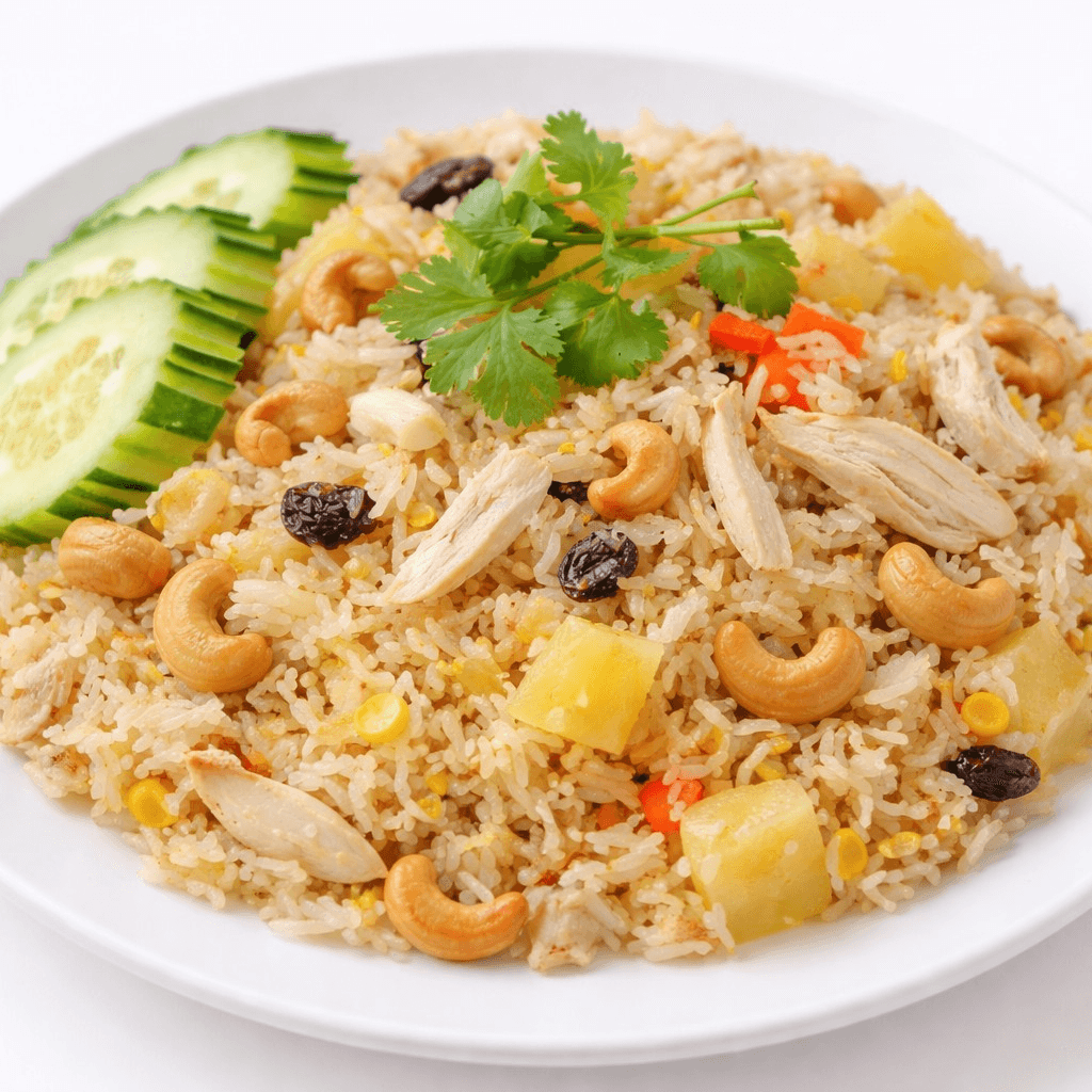 Fried rice with pineapple, eggs, raisin, cashew nuts, onions, carrots