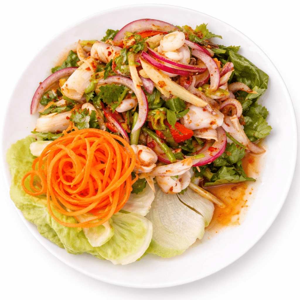 Squid salad mixed with onions, chili, ginger, basil and lemongrass in lime dressing