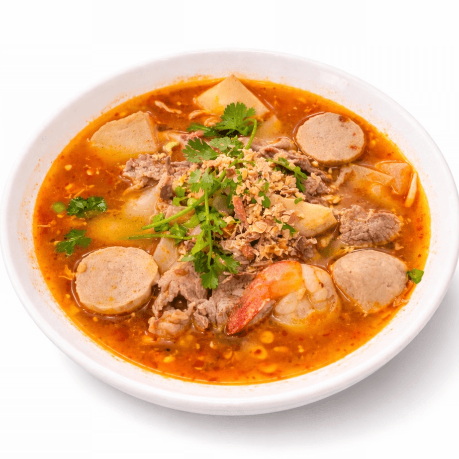 Hot. Special pork tomato broth soup served with round rice noodles, sliced pork, ground pork, diced tomatoes and assorted vegetables