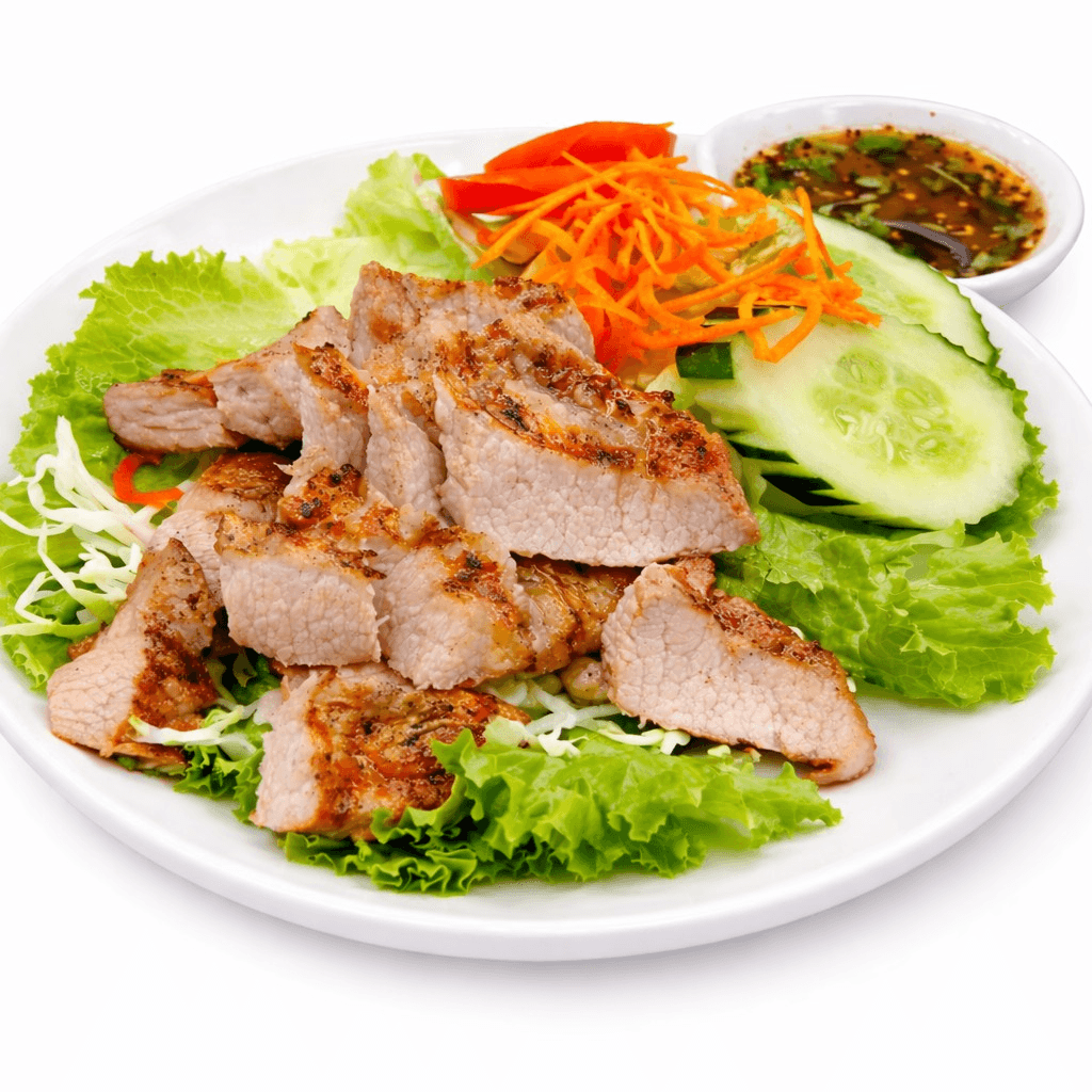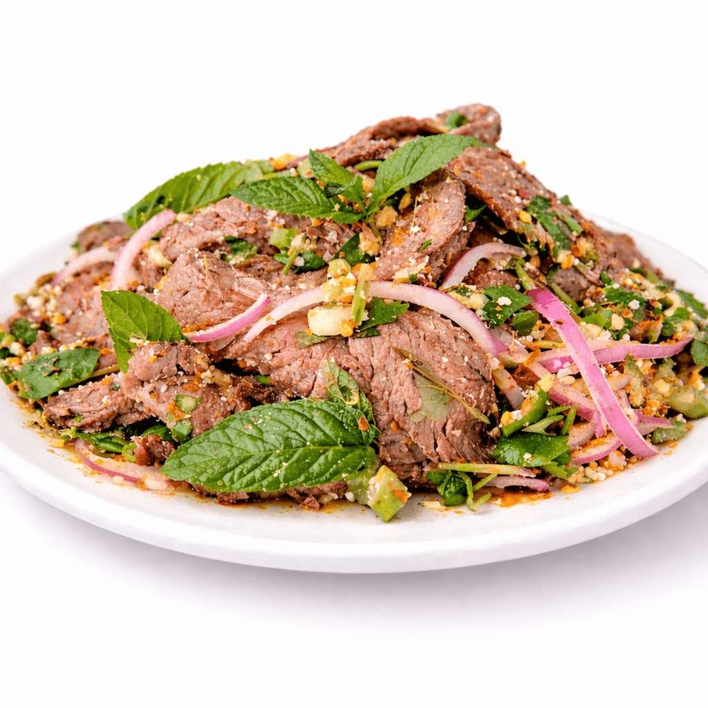 Choice of sliced roasted beef or pork with mint, red onions, scallions, cilantro and ground roasted rice in lime dressing