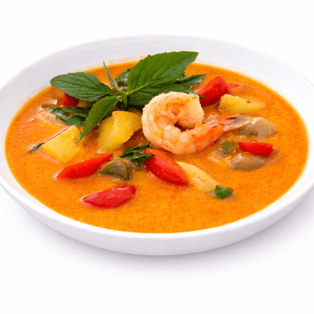 Gluten Free. Shrimp in medium red curry with pineapple, tomatoes, and fresh basil serve with rice