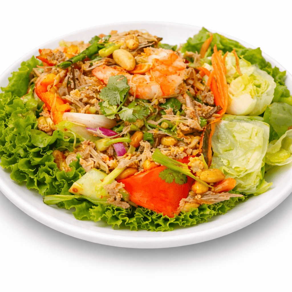 Shredded green papaya salad with grilled shrimp, chili and cherry tomatoes tossed in a chili-lime dressing